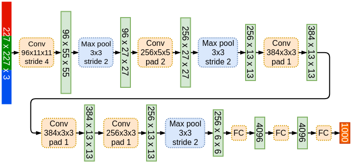 Input layer - Conv1 - MaxPool1 - Norm1 - Conv2 - MaxPool2 - Norm2 - Conv3 - Conv4 - Conv5 - MaxPool3 - FC1 - FC2 - Output layer순서